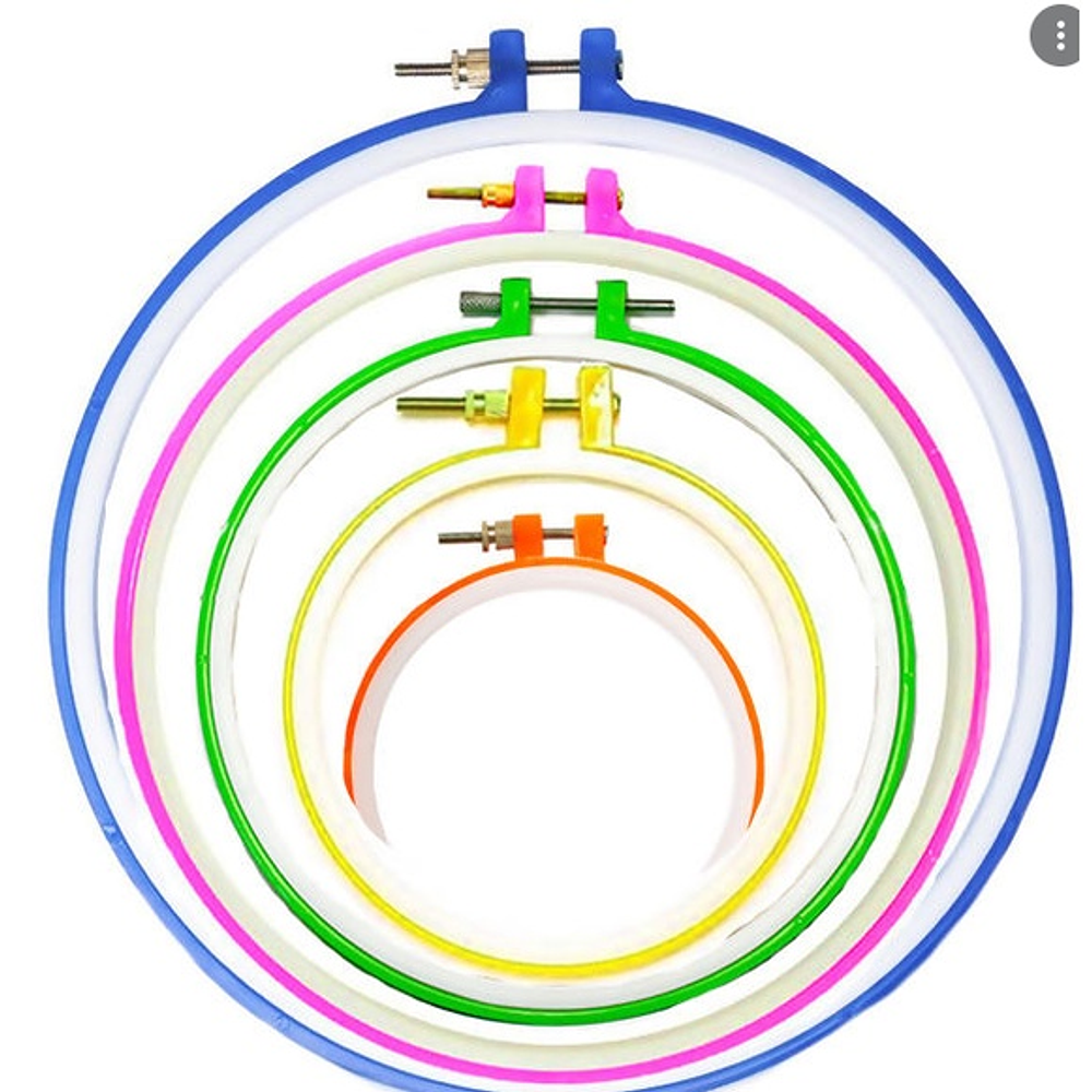 Descripción: Bastidor para bordar plástico se utilizamos para tensar la tela que vamos a trabajar. Son dos aros, de diferente tamaño, que encajan uno con el otro y se ajustan a través de un tornillo. Ideal para bordar, pintar, adornos, organizadores y manualidades en general.