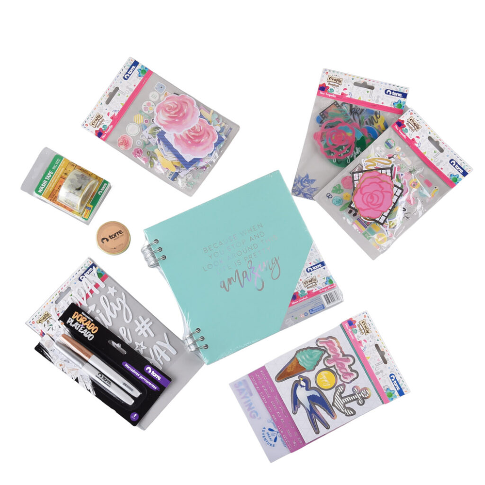 INCLUYE: Deco troqueles, Stickers, Album scrapbook, Marcadores permanentes, Washi-tapes.