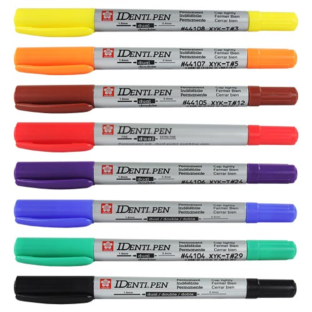 Una punta es para detalles, extra fina de plástico que no se romperá. La otra es para líneas mas gruesas con una fibra hecha para resistir. Tinta en base al alcohol, resistente al roce.
