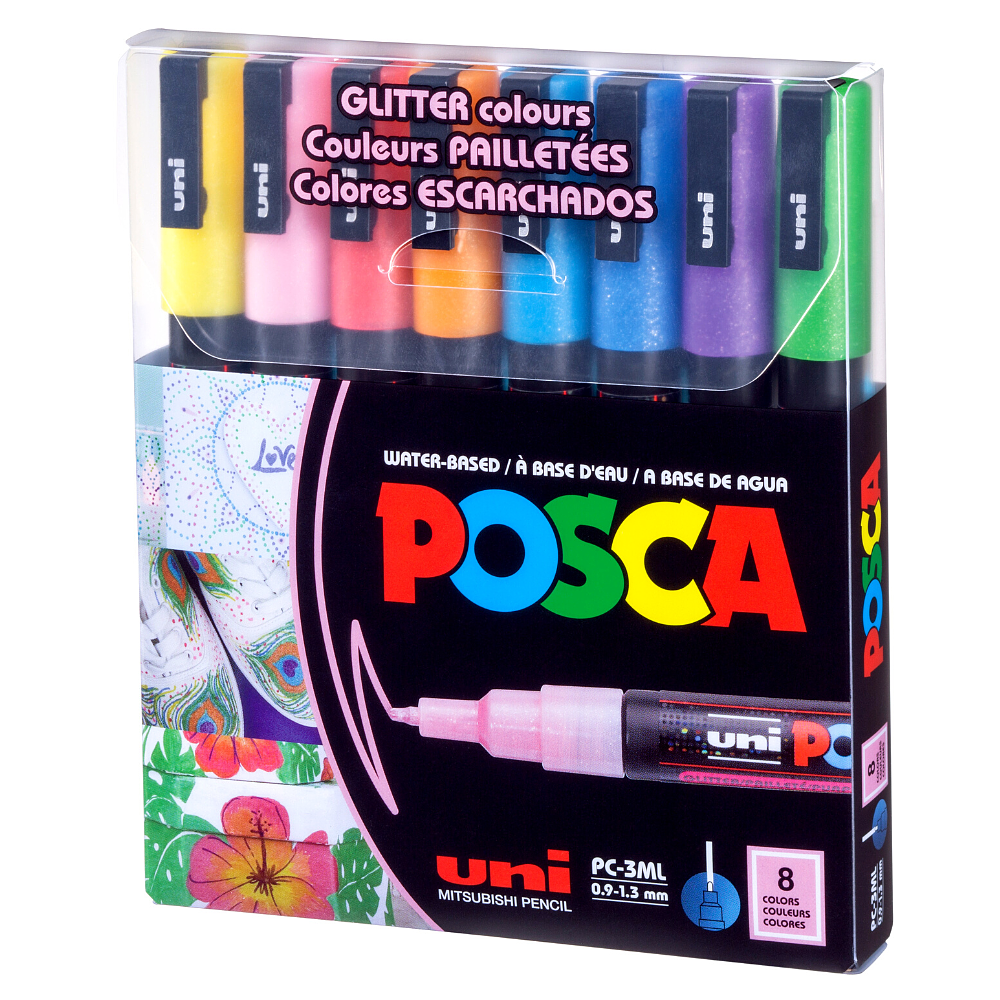 Posca PC-3M (1.8-2.5mm). Set 8 colores Amarillo, Rosado, Rojo, Naranjo, Azul, Azul claro, Violeta y Verde.