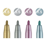 Descripción: Set de marcadores Pitt Artist Metalico, contiene 4 marcadores de colores metálicos, su tinta pigmentada es súper resistente a la luz, es ideal para bocetos, dibujos, layouts, diseño de moda e ilustración, no atraviesa el papel y posee gran cobertura en papel oscuro.